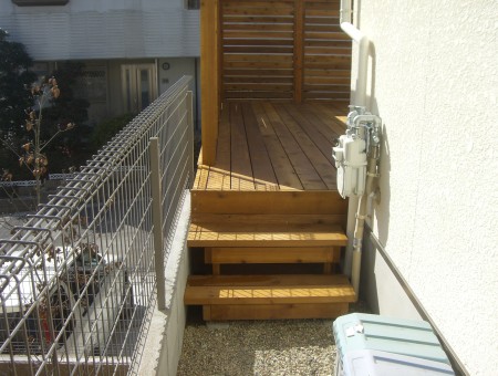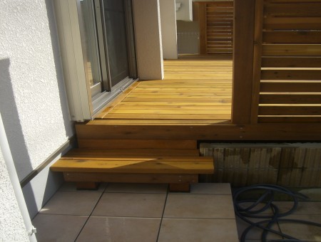 ウッドデッキ部分=シダー材・スプルース色になります。お客様のご要望通り、↓写真右側の玄関先からデッキを渡った所に小さい階段を設けスムーズに行き来できるようにとつくらせていただきました。