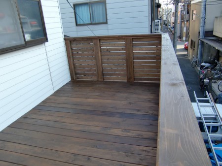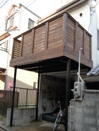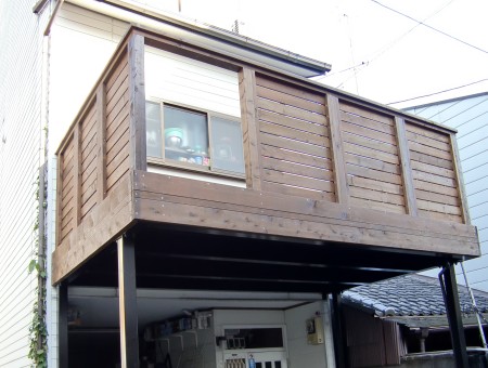 お客様の敷地内いっぱいにガレージデッキをつくらせていただきました。二階の出入り口が後施工と言うことで大変不便だったと思われますがその後順調にお過ごしになられたでしょうか?またお気軽にご連絡ください。