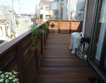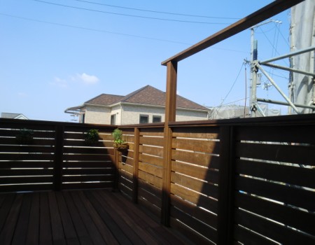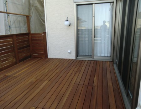 ガレージデッキは、特にウリン材を使用すると、雨に当たり赤茶のアクが床下に流れ出しひと騒動になりかねますので、当店では、V型デッキに孔を開け、トユに流れるように工夫しています。施工を考えている方は、排水できる場所を確保していただければ幸いです。ご近所様との兼ね合いもあるかと思いますので、近隣の方と御相談してからの施工をお考えくださいます様ご協力お願い致します。
