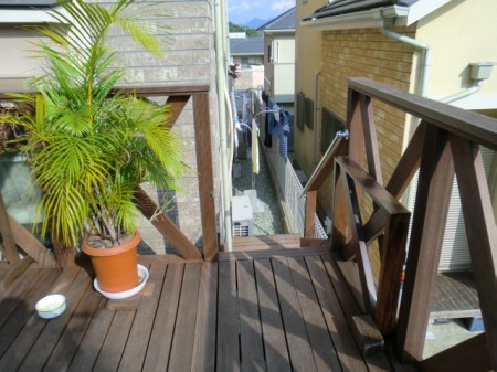 ウリン材の弱点としては、ポリフェノールという優れた抗菌効果のある物質を含んでおり、害虫等を寄せ付けませんが、このポリフェノールが溶け出し、コンクリートや地面を汚してしまいます。 この点が、ウリンの欠点といえば欠点ですが、この現象は樹液が全て出てしまうと治まります。また、汚れはキッチンハイター等で落とすことは可能ですので、お客様に少々お手間をとらせますがご理解の上ご了承くださいませ。ウリンについて