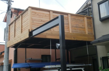 今回からの施工例は、当店で施工されたお客様でまだ更新されていないお宅を調査してのアップとなりました。このお客様は、私が当店に存在しない頃のガレージデッキとなります。材質はアメリカンレッドシダーで塗装色は、スプルースだと思います。もし間違ってたら申し訳ありません。塗装色は、色見と比べても季節・塗装した際の気温などで変化するのでなかなか見分けがつきにくく塗装する人によっては様変わりしやすいのが現実です。もし定期的に塗り替えする方は、いつもどの時期どの具合で塗装していたか覚えておきましょう。なんだか、本日は、ちょっとした塗装講座になりましたが、これで失礼致します。