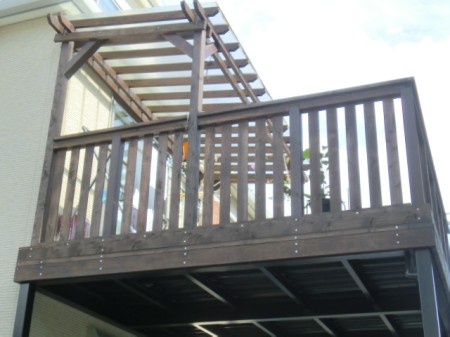 パーゴラ+屋根部(ポリカーボ製)ガレージデッキを施工させていただきました。材質は、アメリカンレッドシダーとなっております。なにやら寂しい施工写真のワンショットになりました。お客様、誠に申し訳ありません。完成写真を撮り忘れたものが悪いのです。さて、誰でしょう? さておき、シダー材で施工させていただきましたお客様方、定期的なメンテナスはお済でしょうか?