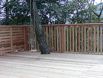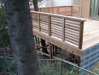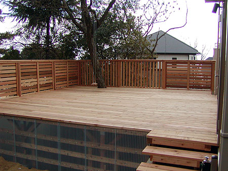 【ちょっと一言】 写真では分かり辛いのですが、高さ3メートルある崖っぷちです。小さな木を伐採して、大きな木を一本残しました。その部分は床板をRにカットしています。木にはシンプルなブランコを一つ。お子様には大好評です。