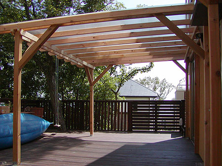 ウッドデッキ部分の広さは羨ましいほどです。後に追加施工でパーゴラを立てて、カヌーの置き場を作らせていただきました。