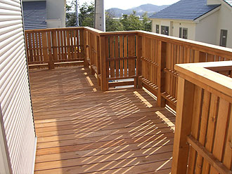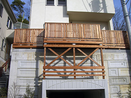 【ちょっと一言】こういった場所にデッキを設置するのは少し難しいのですが、当店は独自の高所用金具を使用することによって、短期間での施工を可能にしています。