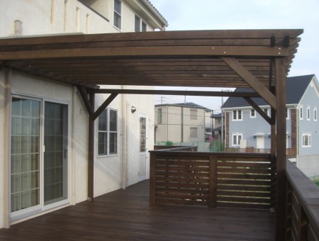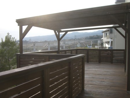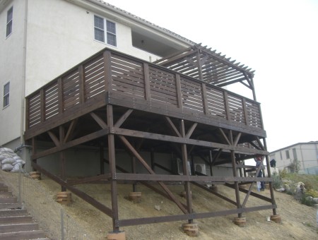 【ちょっと一言】少し広めの傾斜地を有効活用しパーゴラ付・高床デッキを作らせていただきました。