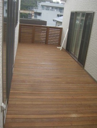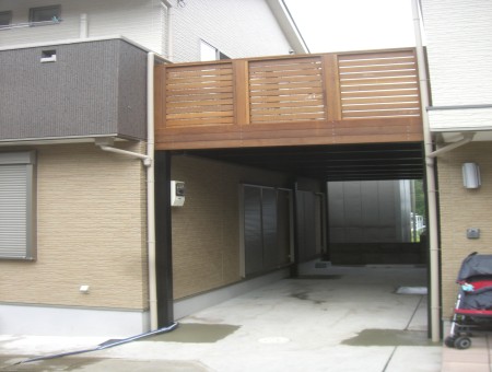 お客様のご要望通り、両隣=兄妹の新築ご自宅の二階部分間にお互いの家から行き来できる様に、柱・デッキ床下部分まで鉄骨構造で組み上げその上にウッドデッキを施工させていただきました。